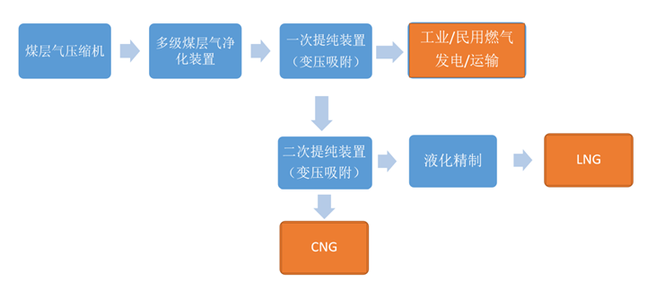煤层气/沼气回收提纯甲烷装置是依据气体在高压下吸附低压下解吸的原理对混合气进行分离提纯,含甲烷尾气经净化加压后进入PSA系统分离得到不同浓度甲烷产品气,依据原料气中甲烷含量的差异以及产品气设计工艺路线。